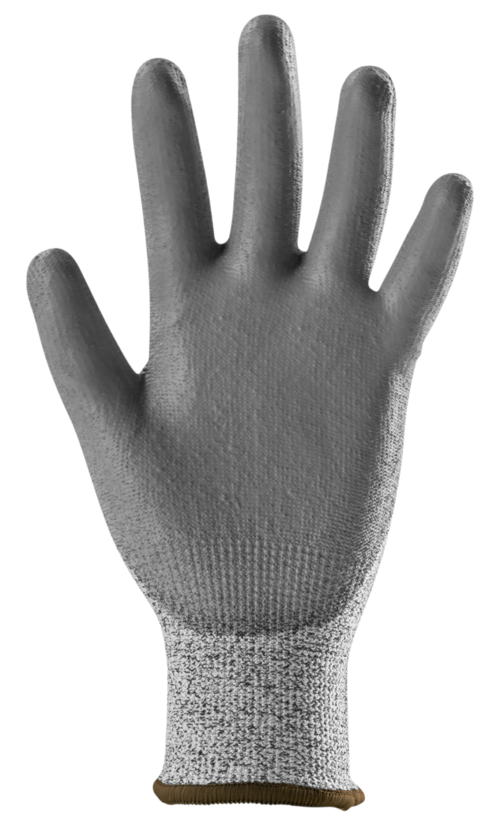 Szürke kötött, HPPE és üvegszál alapanyagú, 13-as kötésű védőkesztyű, szürke PU bevonattal a tenyéren.