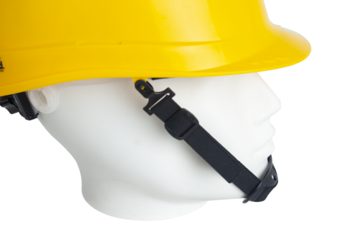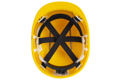 PELICANO sárga védősisak, 6 pontos sisakkosár, racsnival és két pontos sisakszíjjal