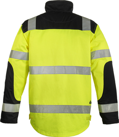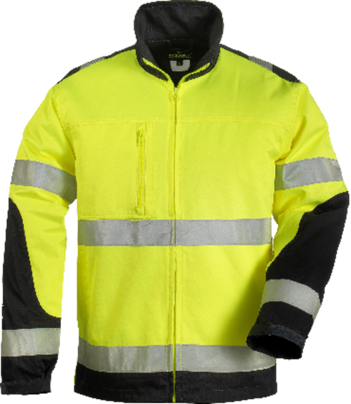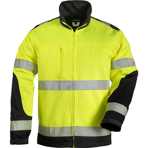 * hagyományos gallér tetejéig cipzárral záródó dzsekifazonú kabát, két rávarrt oldal-, egy cipzáros mellzseb, tépőzárral állítható mandzsetta,2 testen és 2 karokon körbefutó fényvisszaverő csík
