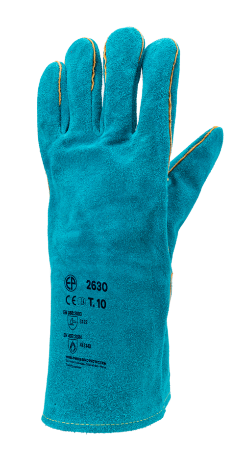 Zöld marhahasíték kesztyű gyapjú belsővel, hasítékbőr biztonsági mandzsettával, pamut béléssel. Mandzsetta hossz: 15cm