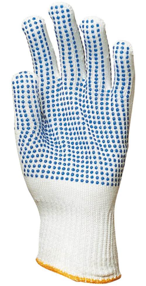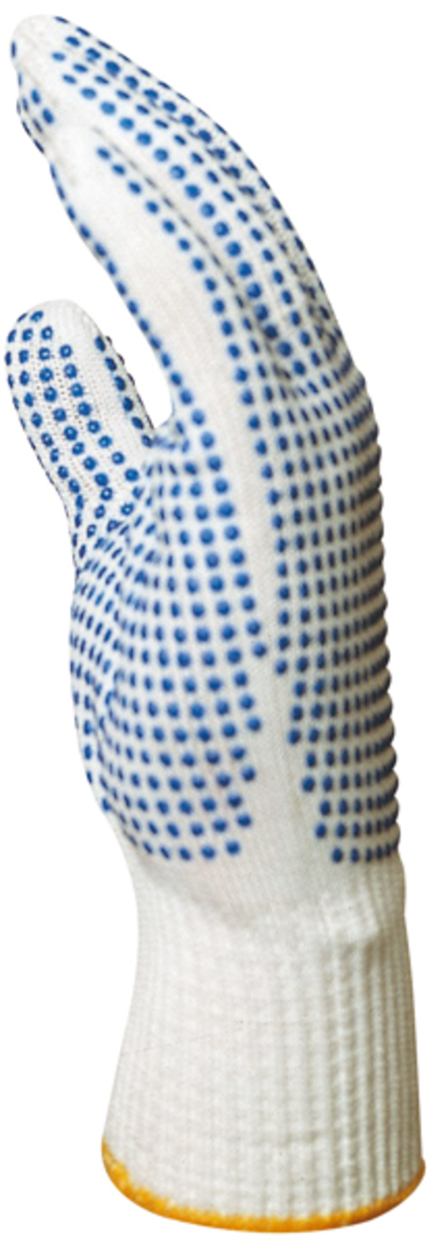 Fehér, varrás nélküli, polészterrel erősített kesztyű, tenyerén és a kézfejen kék PVC pötyökkel